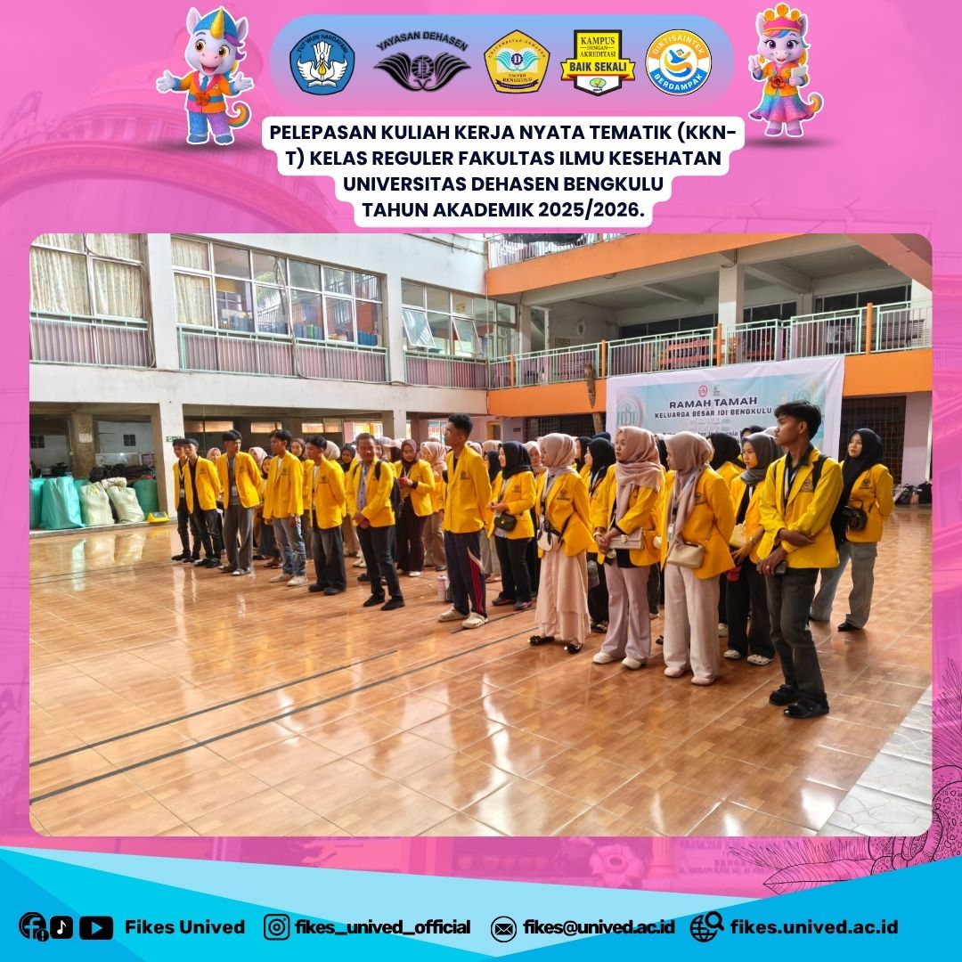 Bengkulu – Sebanyak 80 mahasiswa dari Fakultas Ilmu Kesehatan (FIKES) Universitas Dehasen (UNIVED) Bengkulu hari ini secara resmi dilepas untuk memulai pengabdian masyarakat melalui program Kuliah Kerja Nyata Tematik (KKN-T) Kelas Reguler Tahun Akademik 2025/2026. Tema besar yang diusung tahun ini adalah “Pemberdayaan Kesehatan Menuju Masyarakat Sehat dengan Kearifan Lokal Budaya”. Para peserta KKN-T ini […]