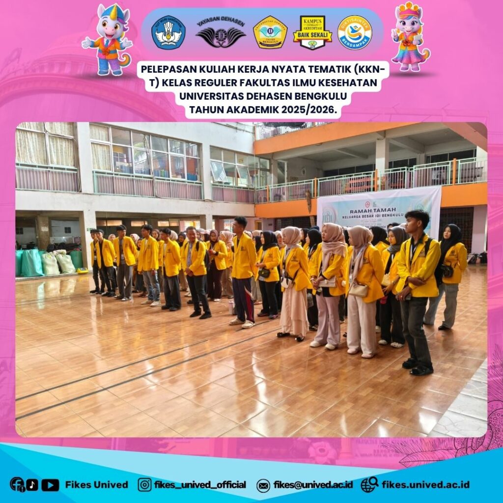 Bengkulu – Sebanyak 80 mahasiswa dari Fakultas Ilmu Kesehatan (FIKES) Universitas Dehasen (UNIVED) Bengkulu hari ini secara resmi dilepas untuk memulai pengabdian masyarakat melalui program Kuliah Kerja Nyata Tematik (KKN-T) Kelas Reguler Tahun Akademik 2025/2026. Tema besar yang diusung tahun ini adalah “Pemberdayaan Kesehatan Menuju Masyarakat Sehat dengan Kearifan Lokal Budaya”.